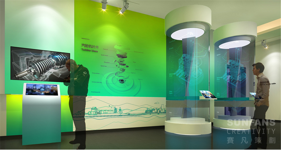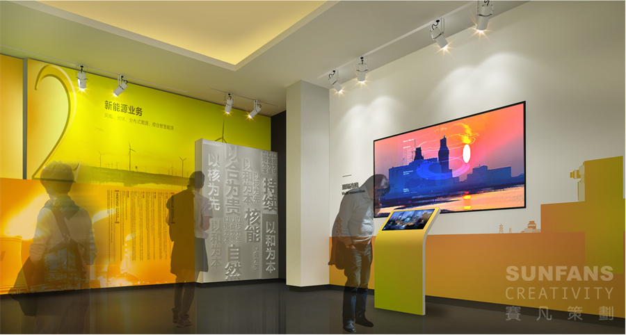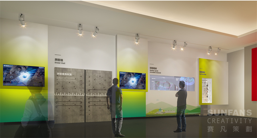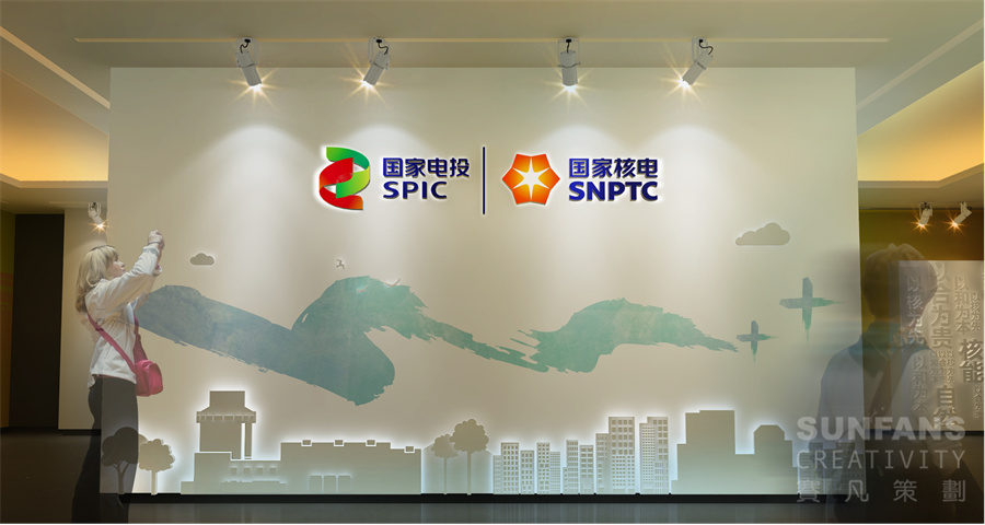 整個展廳以“合”與“+”作為設計元素,意寓著百尺竿頭更進一步,將“+”、自然環(huán)保、核電、智慧型城市等元素以畫卷的形式呈現(xiàn)在形象墻上,烘托國家核電的發(fā)展理念,為整個展廳奠定了整個基調。