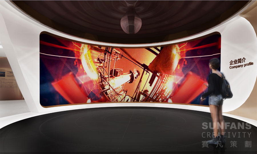 我們以石油油滴為意向的中心雕塑造型,凸顯著行業(yè)屬性,配合大型弧幕共同組成智慧之光虛擬劇院,地面鋪設(shè)深色地膠,通過(guò)燈光的漸變效果圖,結(jié)合地膠切割線模擬漣漪效果。煉化基地、智慧工廠等主題影片展現(xiàn)企業(yè)作為世界一流的工程公司的大發(fā)展、大格局、大氣魄。