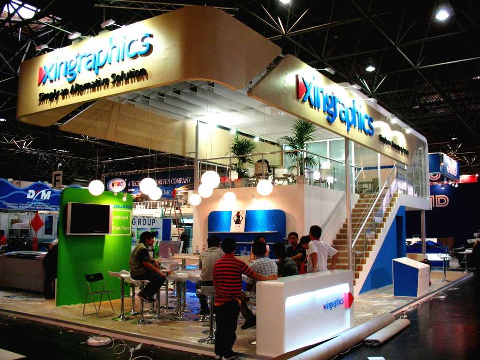 展臺中央放置洽談桌作為業(yè)務(wù)商討,背部綠色的隔斷墻上掛小型LED屏幕,方便視頻宣傳,保證企業(yè)的傳播效果。雙層的的結(jié)構(gòu)頂部為黃色原木材質(zhì),舒緩的顏色營造更加適宜的瀏覽環(huán)境。在側(cè)面使用同種顏色的樓梯,探出行的結(jié)構(gòu)在裝置照明設(shè)備的同時,也成為一個亮眼的造型裝飾。