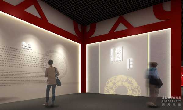 整個(gè)文物館的空間設(shè)計(jì)上從楚國(guó)文化特色的服飾、建筑、漆器文化提取黑紅兩色,既體現(xiàn)了深厚的文化底蘊(yùn),在視覺(jué)上又呈現(xiàn)強(qiáng)烈的裝飾效果。同時(shí)運(yùn)用從鳳鳥(niǎo)、高臺(tái)建筑中提取的傳統(tǒng)紋樣對(duì)空間進(jìn)行裝飾點(diǎn)綴,豐富整體層次。各展廳基于文物特性,形成色調(diào)變化,自成體系。