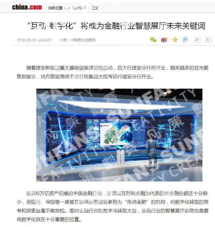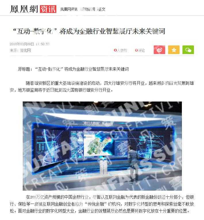 賽凡多年來在展廳設(shè)計建造方面,一直堅持以“作品”為核心,用作品說話的初心,深耕于金融、核電行業(yè)多年。日前,中華網(wǎng)、鳳凰網(wǎng)等各大門戶網(wǎng)站相繼刊登了一篇名為《“互動-數(shù)字化”將成為金融行業(yè)智慧展廳未來關(guān)鍵詞》的文章。