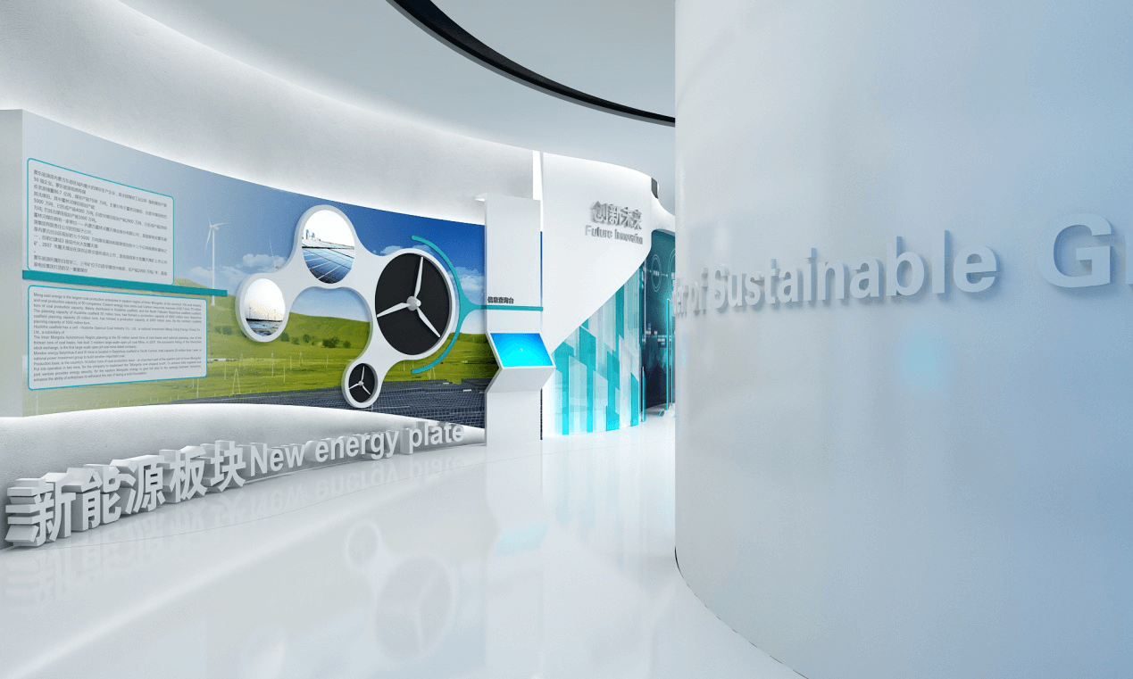 展館以“用智慧鏈通能源” 為題,突出經濟循環(huán)一體化的概念,布局結構中運用循環(huán)、整體的概念,空間開闊、流暢,跟隨參觀,企業(yè)特性自然呈現(xiàn)。