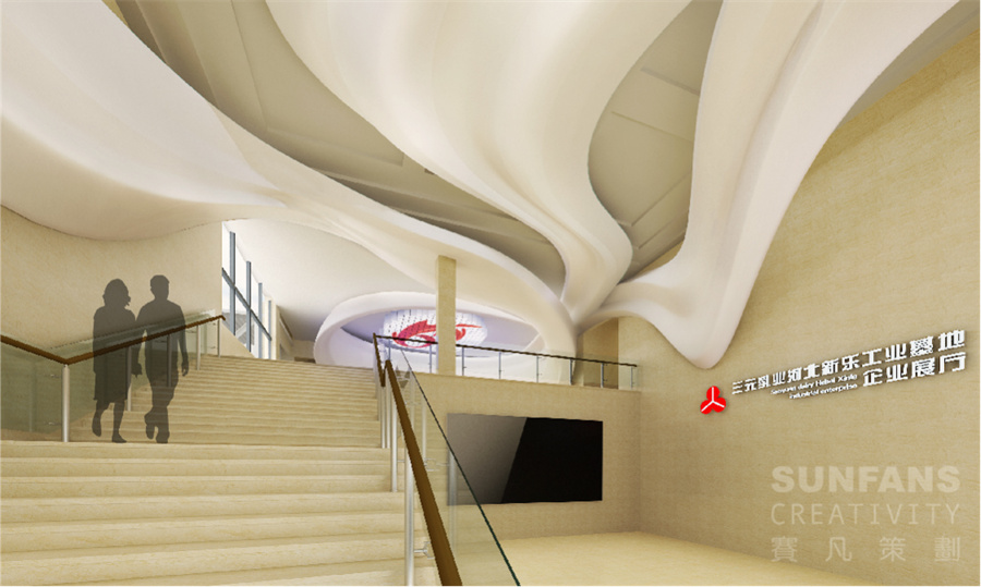 利用挑高空間,抽取三條牛奶流動的形態(tài),象征“良心、愛心、責(zé)任心”,盡頭匯聚成三元logo。