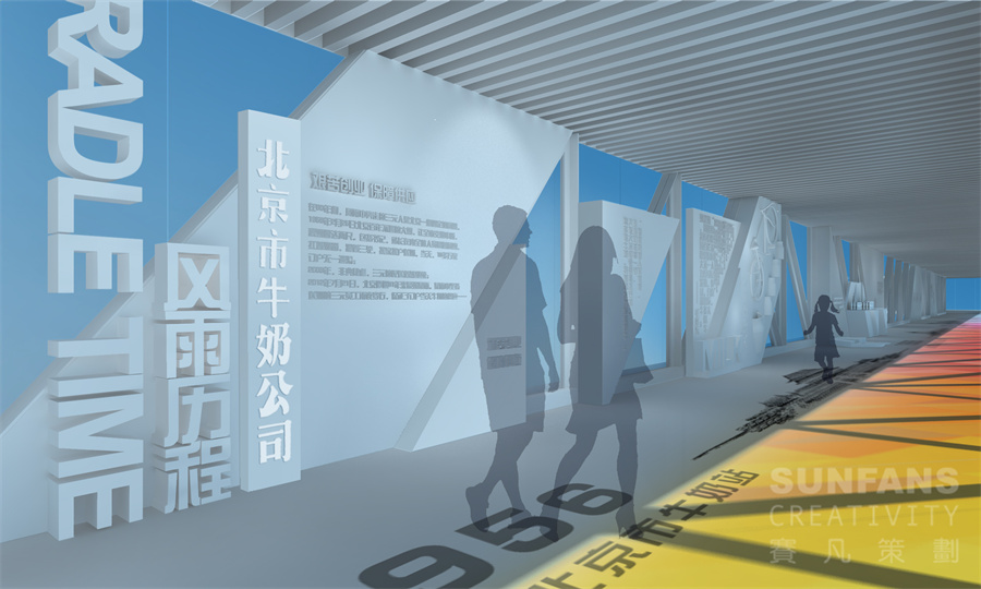 充分利用長廊的幕墻結(jié)構(gòu)和采光特點,設(shè)計一條七彩的時代印記,從我們關(guān)于牛奶的兒時記憶開始,追溯牛奶伴隨了我們成長中的點點滴滴。
