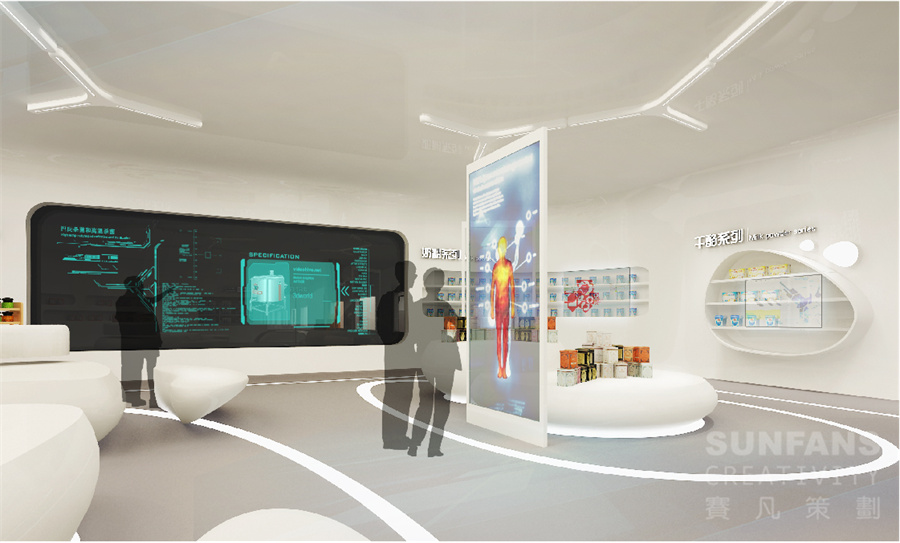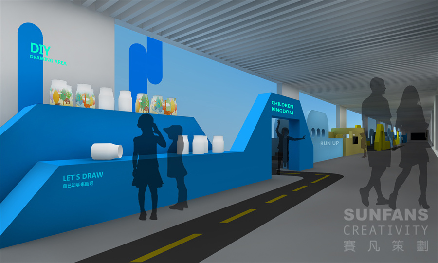 奶粉走廊用純凈的色調(diào)營造適合兒童玩耍的空間,體驗安心、健康的成長環(huán)境。在墻面結(jié)構(gòu)上模擬奶粉的形態(tài)、特性,打破展示內(nèi)容的邊界,將內(nèi)容與形式很好的結(jié)合起來。