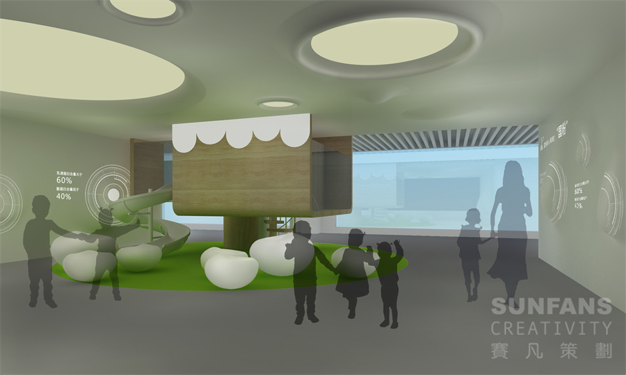 以樹屋展開的奶粉廳,配合柔性奶滴造型沙發(fā),兼具內(nèi)容展示與娛樂性。