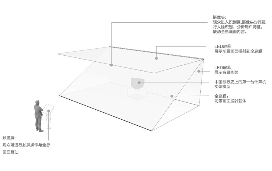 由觸摸屏及虛實(shí)結(jié)合的全息展示模塊組成,觀眾操作觸摸屏可引起全息模塊的視覺(jué)變化。