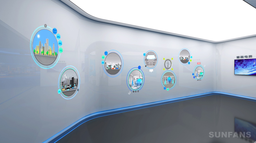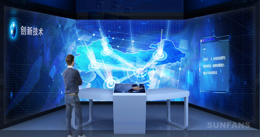 應(yīng)用了高流明投影和觸控傳感技術(shù),將普通墻面變身為光影交互的“魔法墻”。魔法墻支持多人同時(shí)操作,用戶可通過(guò)雙手觸碰墻面和輕掃來(lái)觸發(fā)電網(wǎng)發(fā)、輸、變、配、營(yíng)銷(xiāo)、運(yùn)檢、物資管理等關(guān)鍵環(huán)節(jié)進(jìn)行詳細(xì)展示。魔法墻展示具有易更換的特點(diǎn),方便內(nèi)容的擴(kuò)充。
