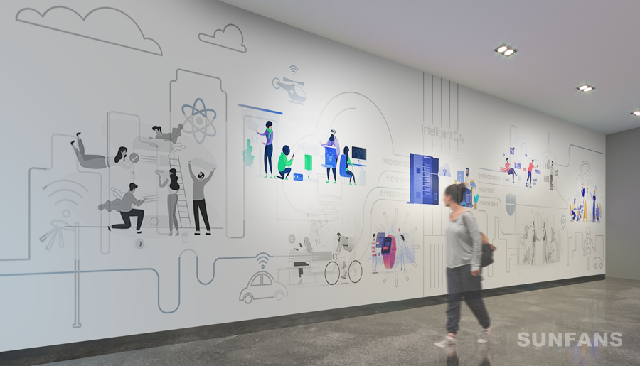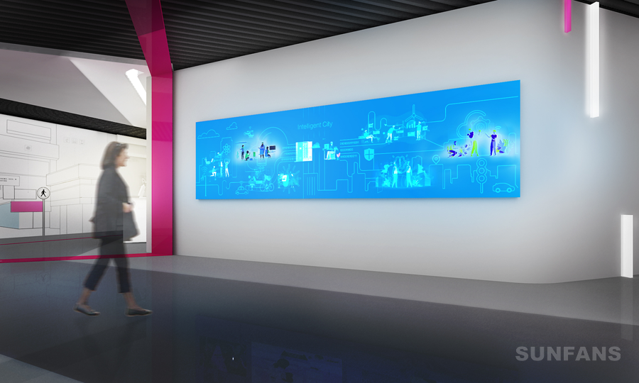 油墨導電互動墻通過近距離觸控識別,墻面正前方安裝兩臺高清投影儀,墻面正上方是雷達感應器,參觀者用手觸碰墻面上的貼圖或投影畫面,靜態(tài)墻面開始發(fā)光/發(fā)聲,觸摸到相應區(qū)域時立刻出現(xiàn)相應的文字、視頻、動畫等內(nèi)容,原先單一的靜態(tài)墻面瞬間“活”過來,呈現(xiàn)一幅內(nèi)容豐富的絢麗畫面。