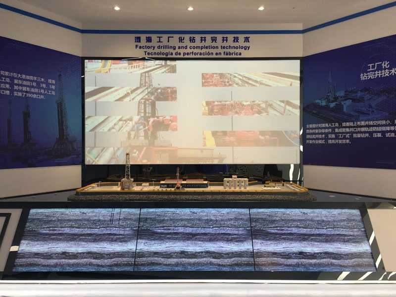 天津渤海鉆探展廳位于天津?yàn)I海新區(qū),布展面積約700平米。全體工作人員經(jīng)過5個(gè)月的全力以赴、精心施工、周密安排,確保展廳順利按時(shí)開館。開館當(dāng)天迎來了第一批參觀人員——伊朗商務(wù)考察團(tuán)。展廳舒服的空間設(shè)計(jì),展示手段的先進(jìn)性以及展示內(nèi)容的數(shù)字化的生動(dòng)直觀性贏得了考察團(tuán)的一致好評(píng),促進(jìn)了洽商雙方的合作意向進(jìn)一步加深。