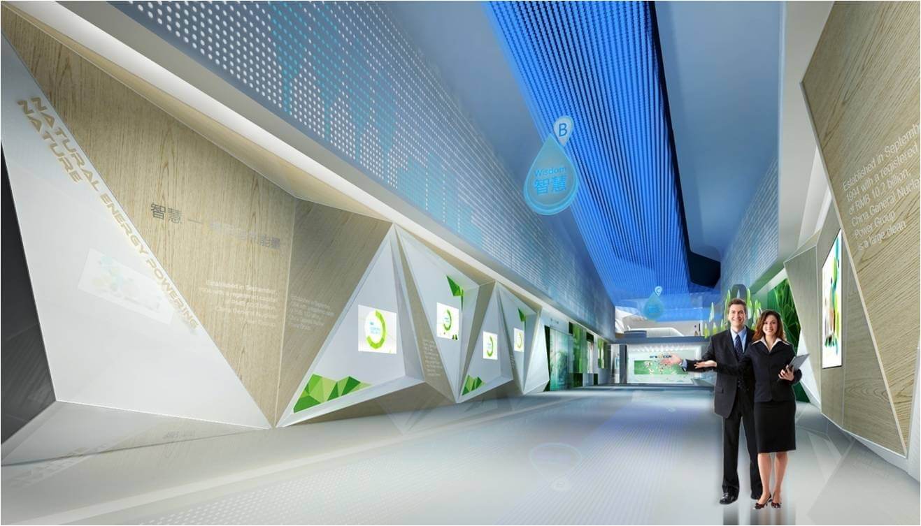 大亞灣基地展廳設(shè)計(jì)屬于長廊型空間,設(shè)計(jì)鑒于核電產(chǎn)業(yè)綠色循環(huán)、臨海建設(shè)的特點(diǎn),在簡約的空間格調(diào)中,引入藍(lán)、綠兩個(gè)點(diǎn)綴色調(diào),增加現(xiàn)代氣息。
